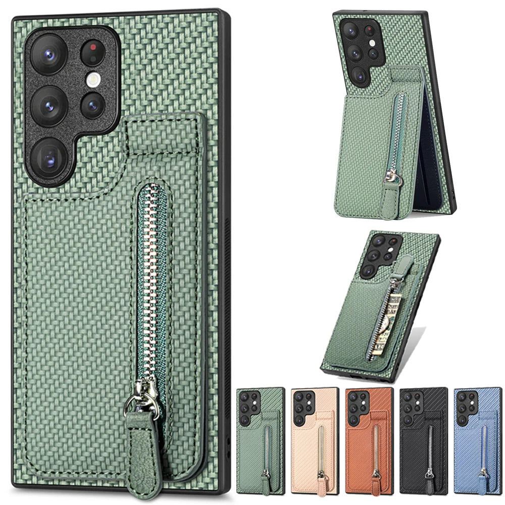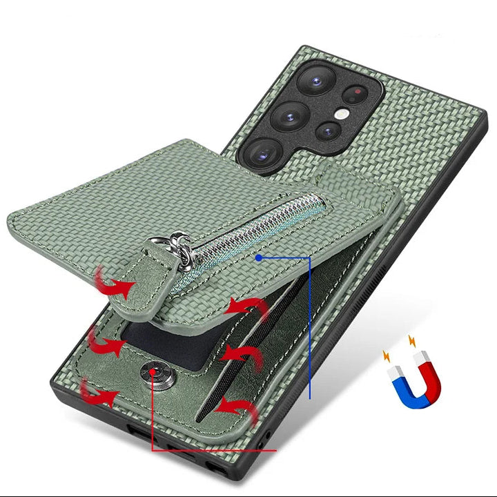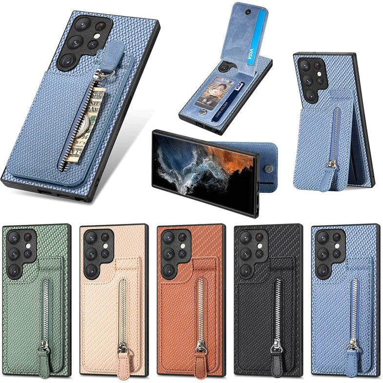 Kunstleder Carbon Optik Kartenfach/Wallet Hülle/Case mit integriertem Ständer für Samsung Galaxy S26, S26 Plus, S26 Ultra